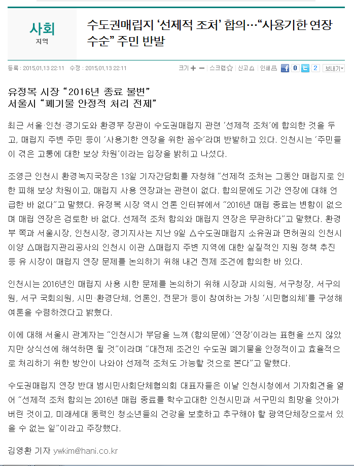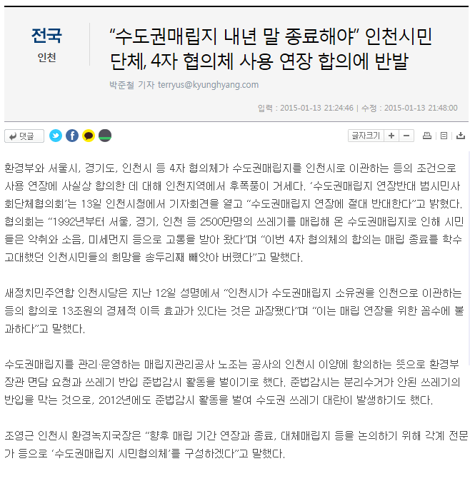 ¼öµµ±Ç¸Å¸³Áö ¿¬Àå¹Ý´ë ¹ü½Ã¹Î»çȸ´ÜüÇùÀÇȸ´Â 13ÀÏ ÀÎõ½Ãû¿¡¼ ±âÀÚ È¸°ßÀ» ¿°í ¡°2016³â »ç¿ëÁ¾·á°¡ È®Á¤µÅÀÖ´Â ¾²·¹±â¸Å¸³Áö´Â ¹Ýµå½Ã Á¾·á µÅ¾ß ÇÑ´Ù¡±°í °Á¶Çß´Ù.À̵éÀº ¡°¼±¸Áö¿ªÀº Áö³ 20³â°£ ¼öµµ±Ç..